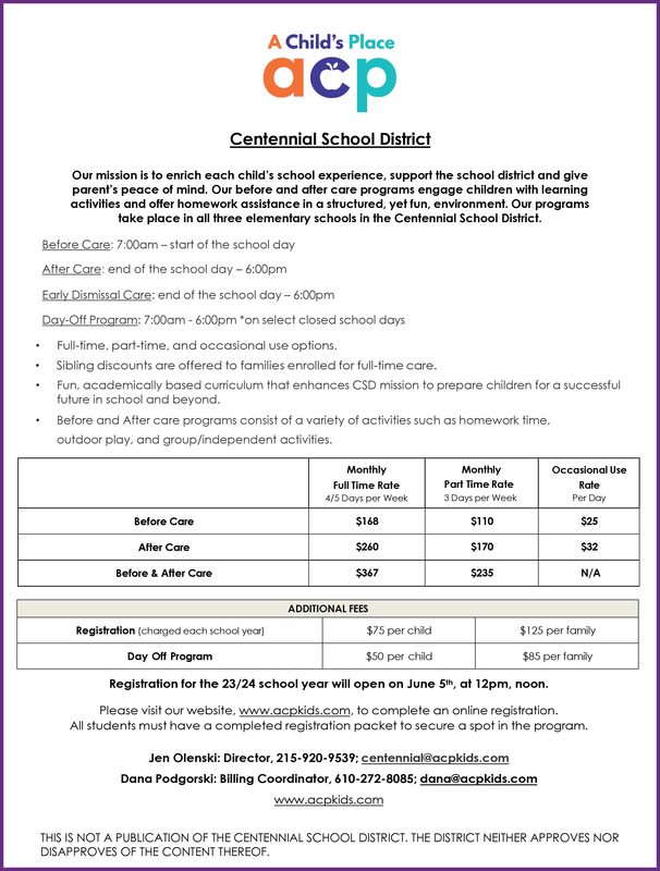 A Child’s Place is currently accepting registrations for before and after care in the three elementary schools! To ensure your child starts on the first day of school, we must receive your registration paperwork by August 11th, 2023. Please see the flyer below for program information including times and pricing!